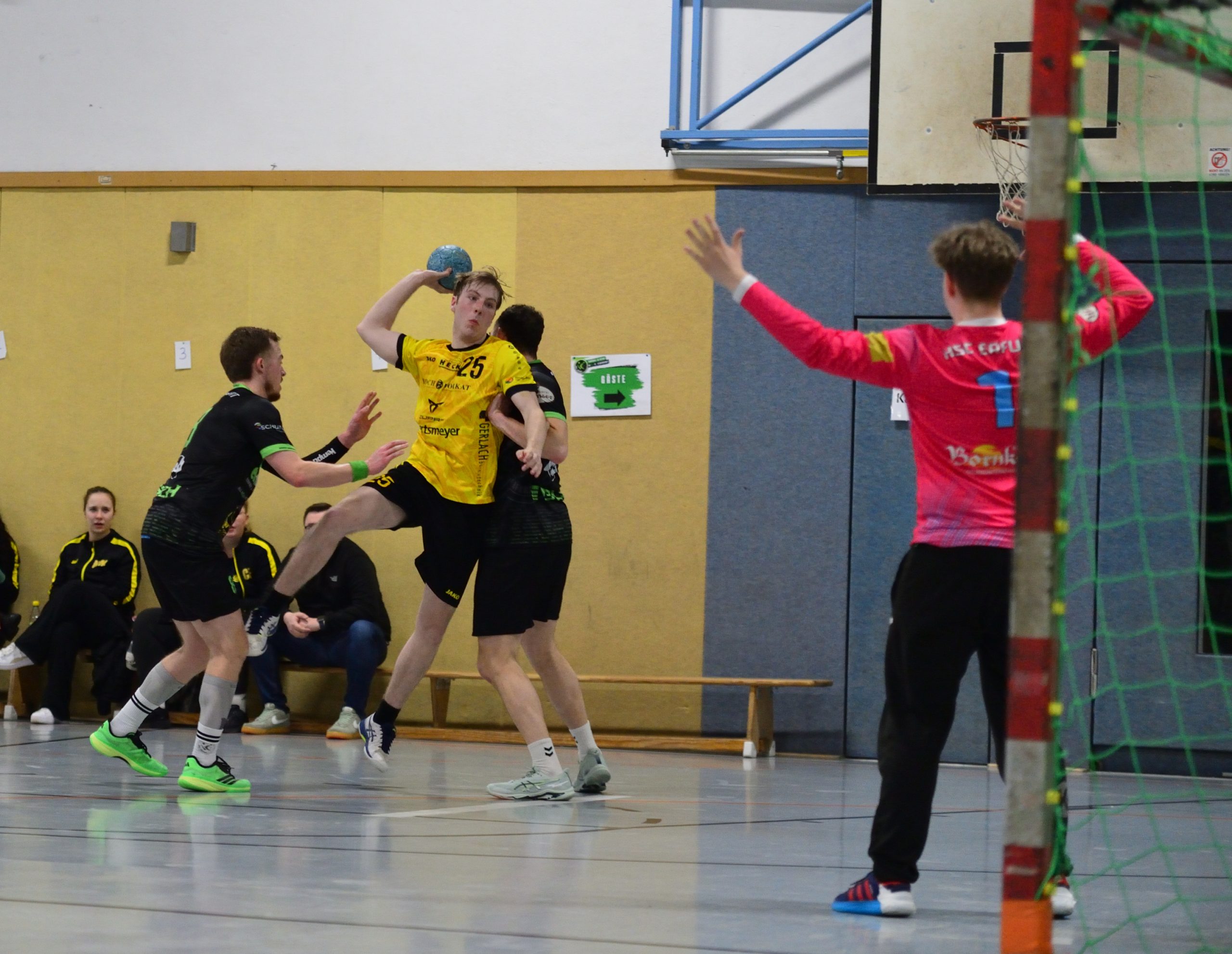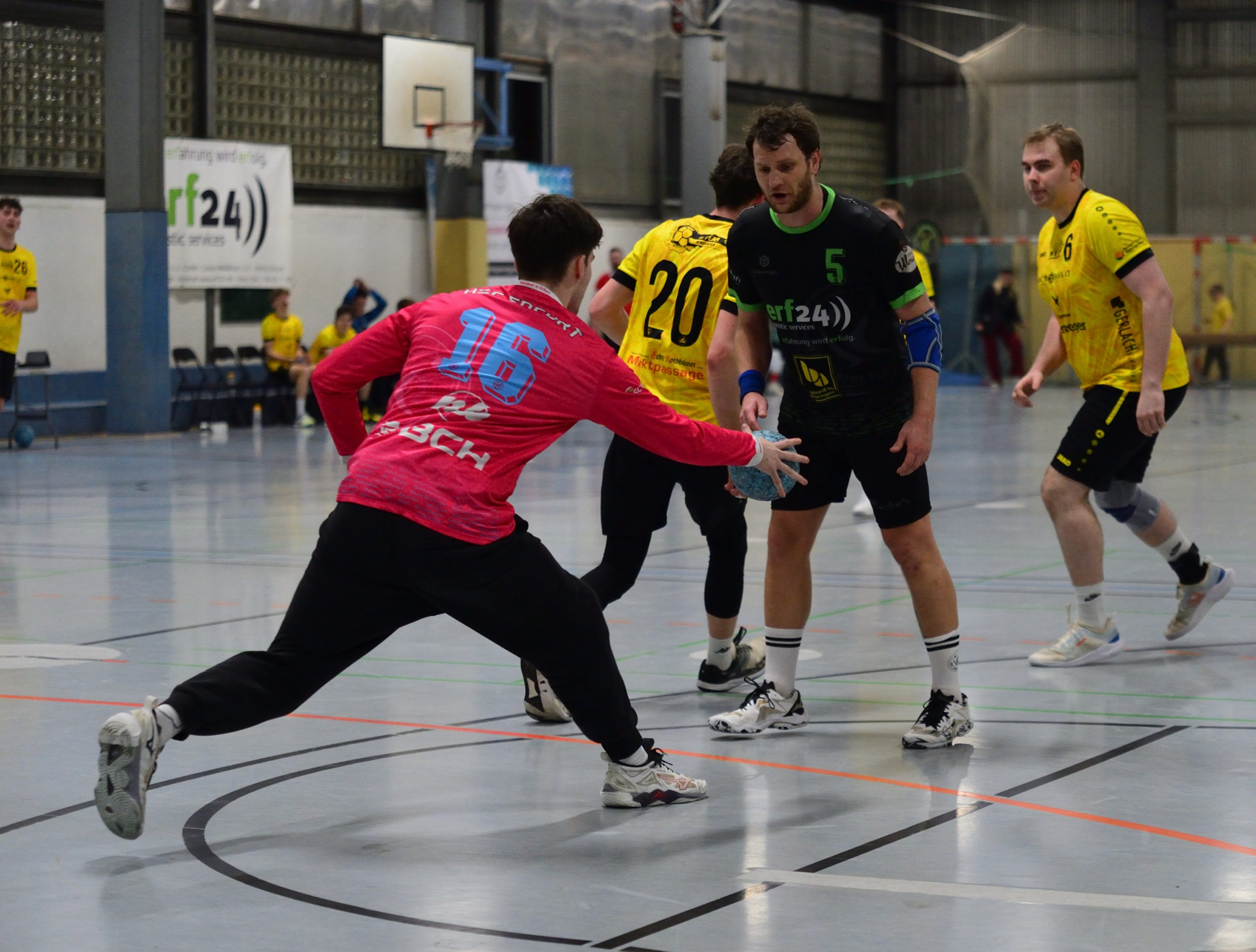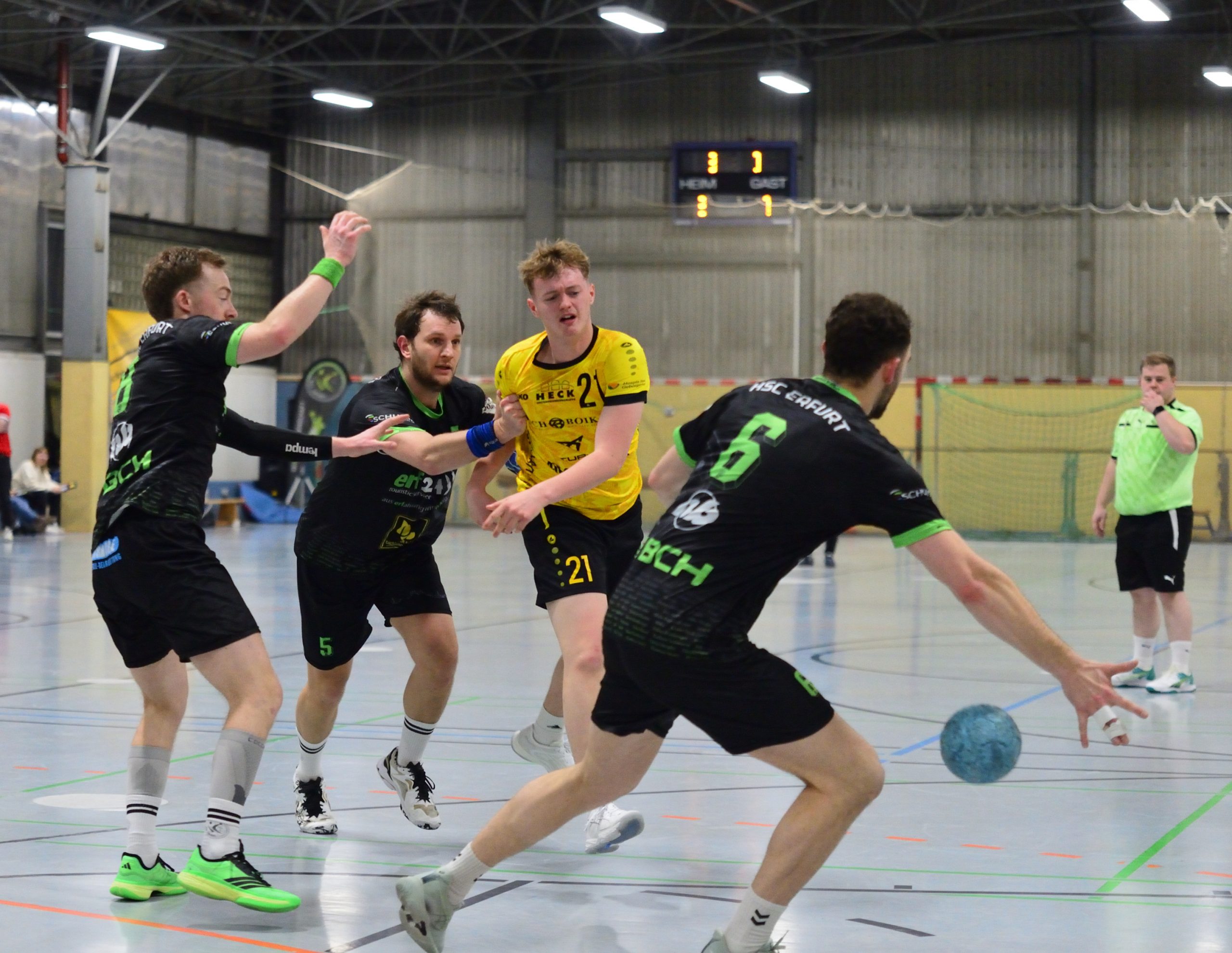Schon die erste Halbzeit deutete an, wohin die Reise gehen würde. Die Erfurter Hausherren erwischten den etwas besseren Start und konnten sich bis zur Pause einen Drei-Tore-Vorsprung erarbeiten. Besonders Jan Reith war an diesem Abend kaum zu bremsen und verwandelte seine Siebenmeter eiskalt.
